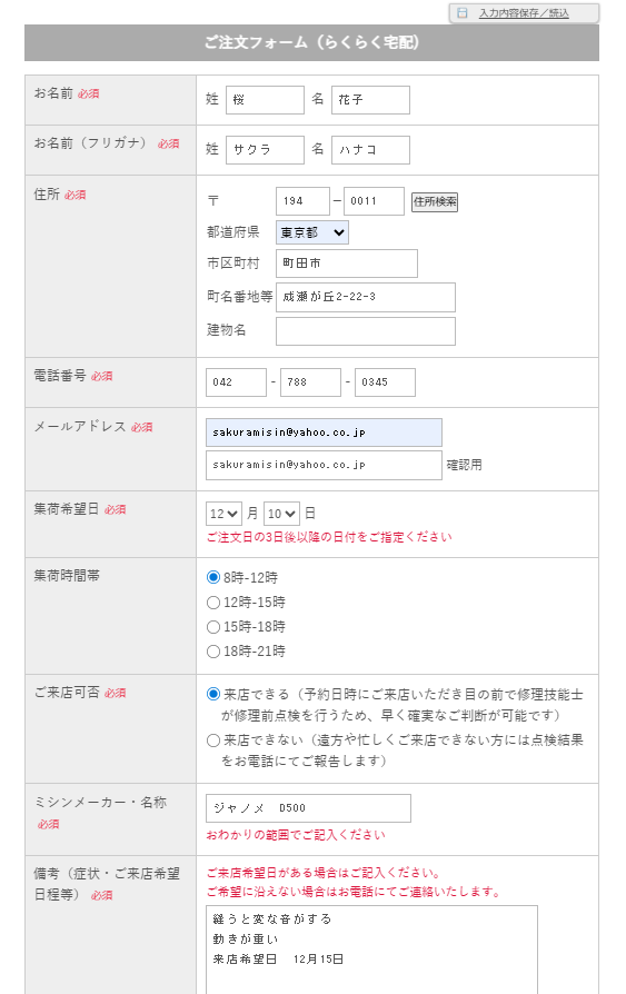 横浜市瀬谷区のお客様よりミシンを修理してほしいが車が使えず運べないとご相談があり、らくらく宅配をご利用いただきました。ミシンが当店に到着した翌日にご来店点検を行うことができ、早く見てもらえたとご満足されていました。 - ・2024年5月29日(水)